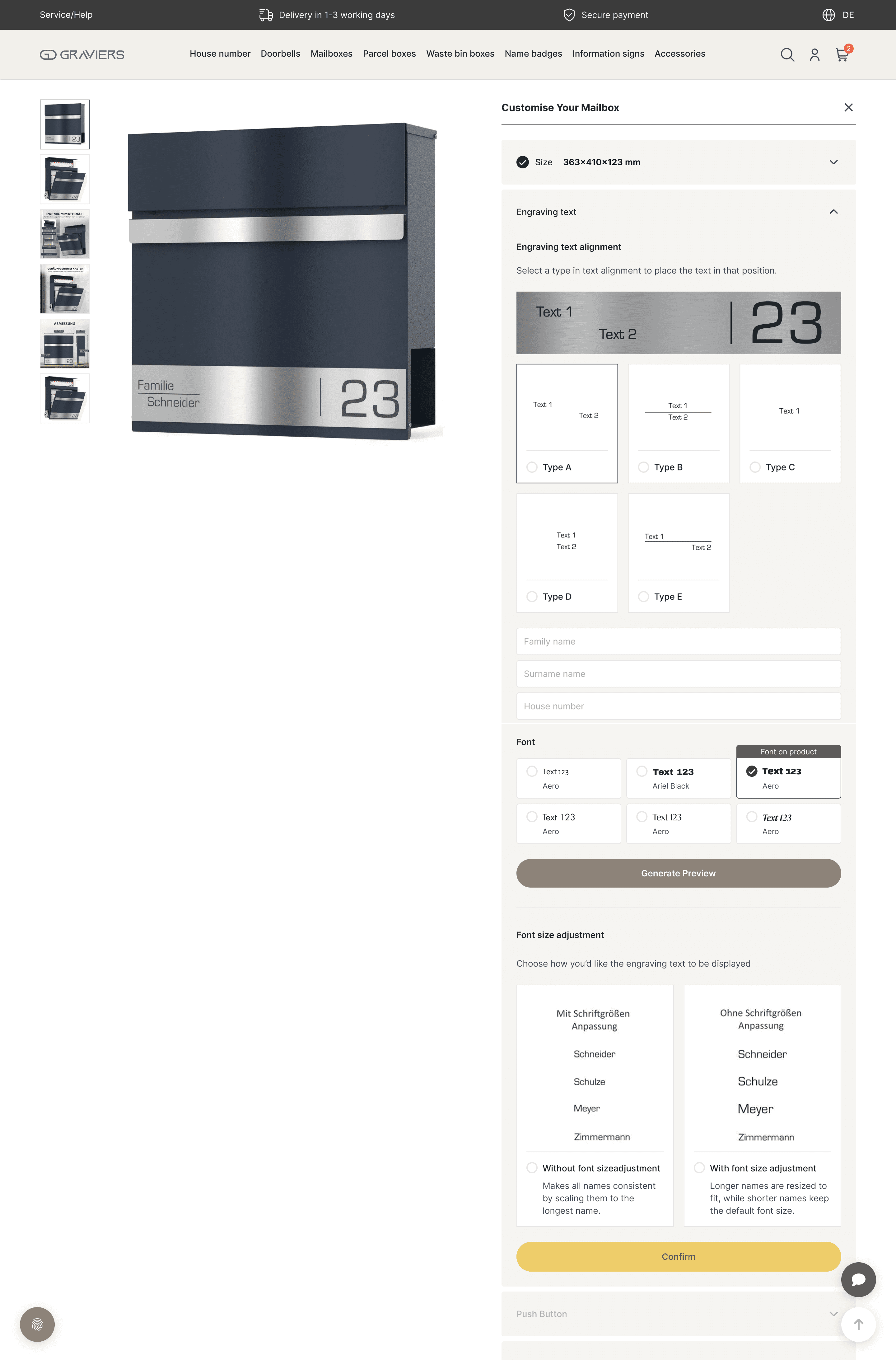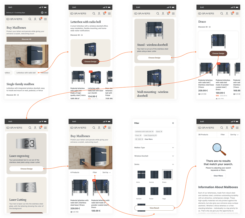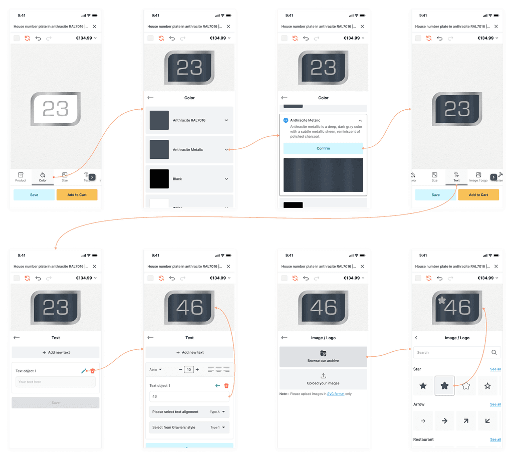 A funnel-style navigation that guides users step-by-step from product type to design and engraving, ensuring a seamless and intuitive journey.