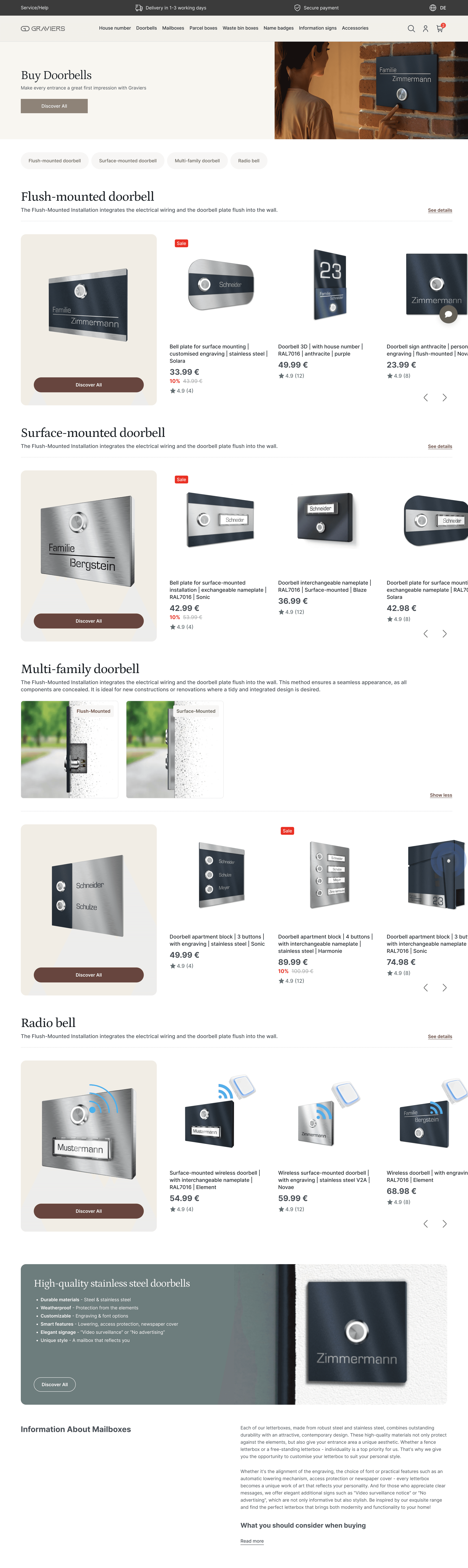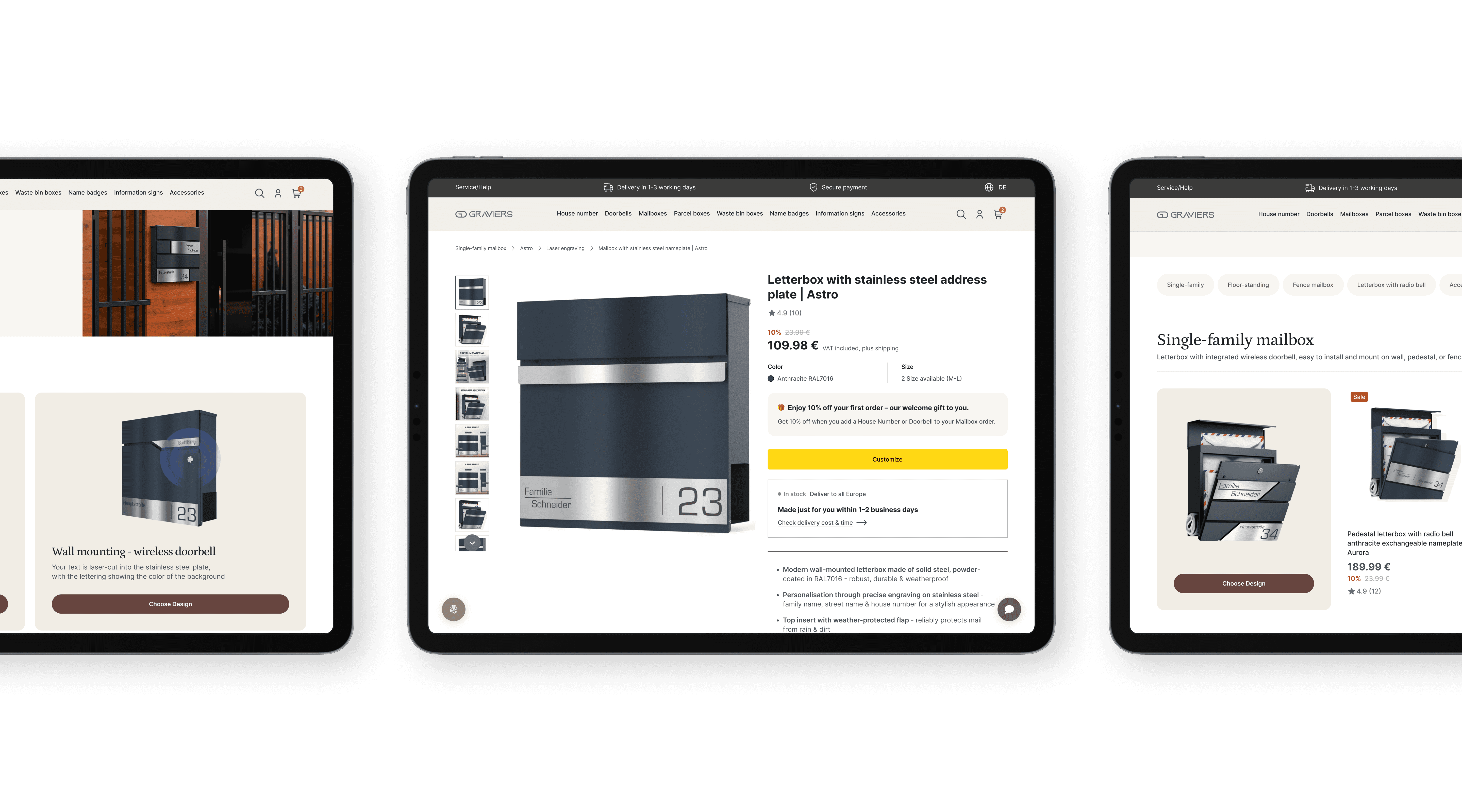 It leads users through a funnel-style navigation, moving them seamlessly from product type to design and engraving.