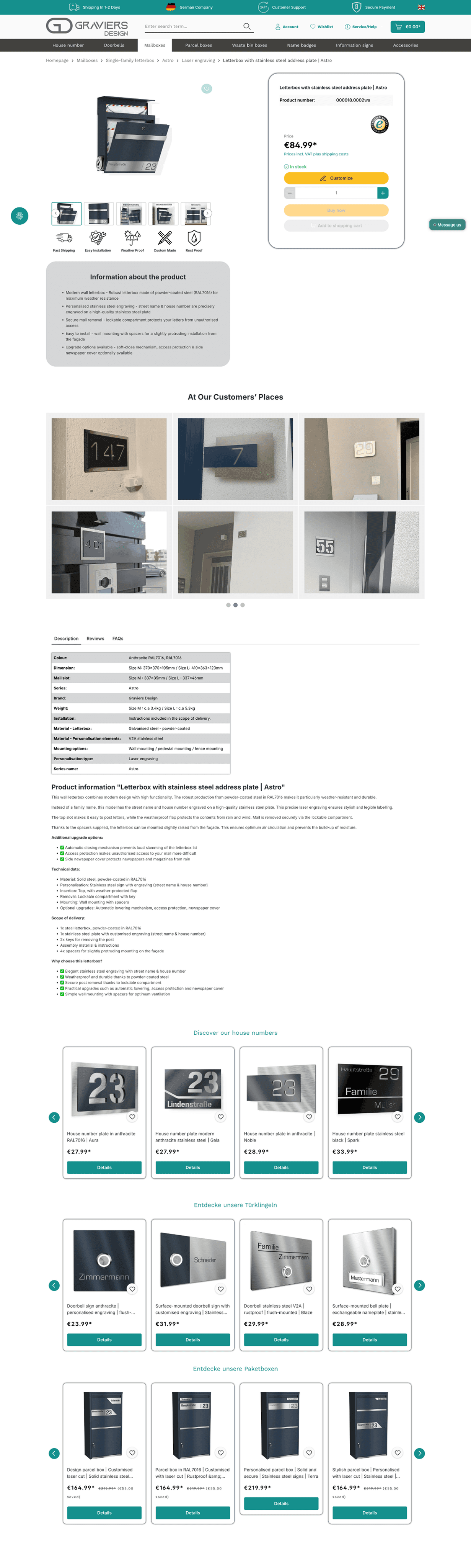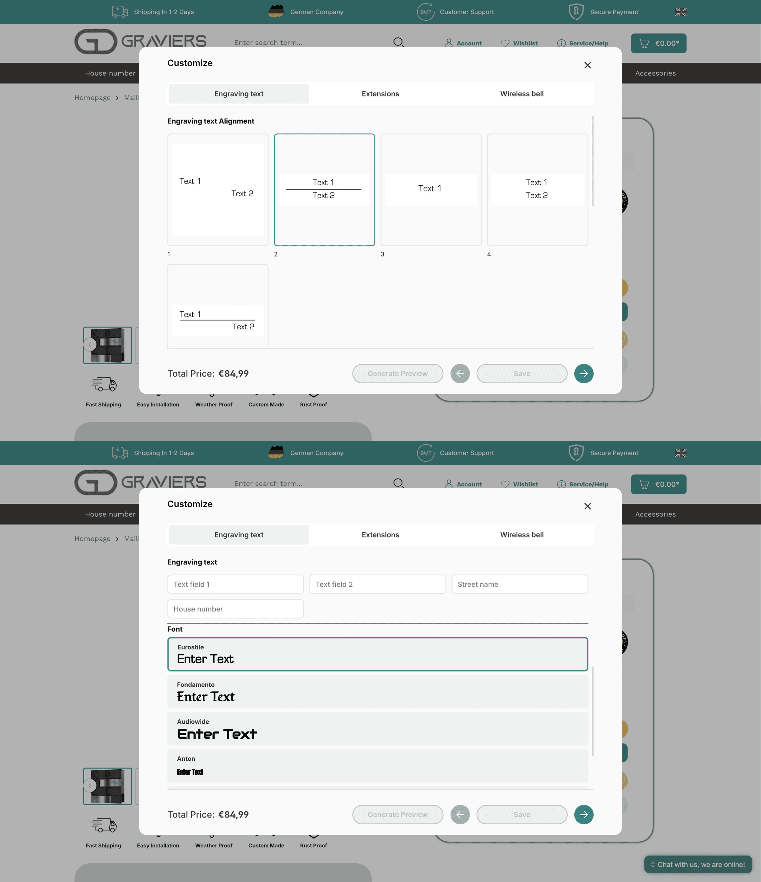 Competitors provide easy customization and live previews, yet they don’t fully cover needs such as product or text size adjustments. Graviers can differentiate itself by combining a 2D customization configurator with real-time previews, a funnel that guides users to the most suitable products, delivering an integrated and seamless user experience.